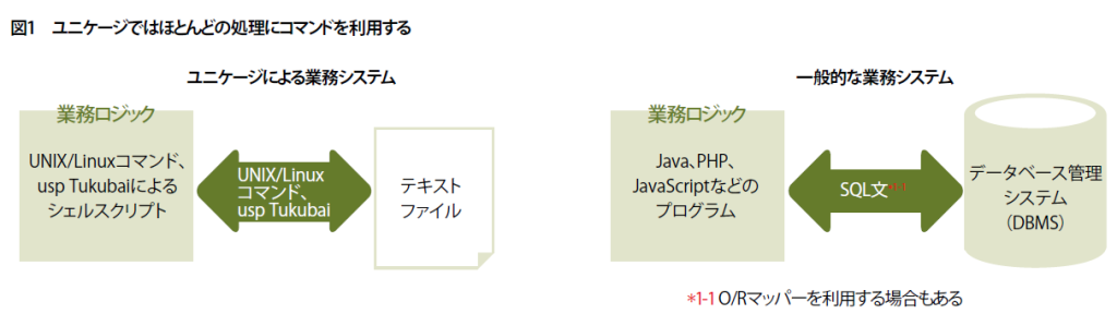 UNIXおよびLinuxでは、端末からコマンドを入力してファイル内のデータを取り出したり、加工して別ファイルに保存したり、同じファイルに上書きしたりする処理をよく使います。ユニケージでは、この特徴を生かすことで、業務ロジックはJava、PHP、JavaScriptなどの言語、データベース管理システム